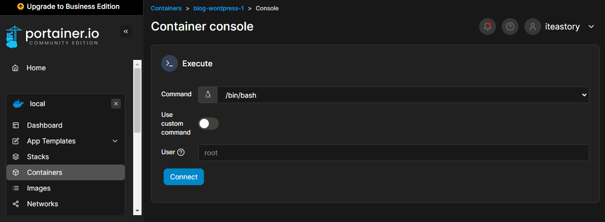 저는 지난번에 Portainer를 사용해서 NAS에 워드프레스를 설치했습니다. 이때 Docker 이미지로 워드프레스가 설치되었는데요. 이걸 기준으로 설명드리겠습니다. 다른 경우도 크게 차이는 없습니다.