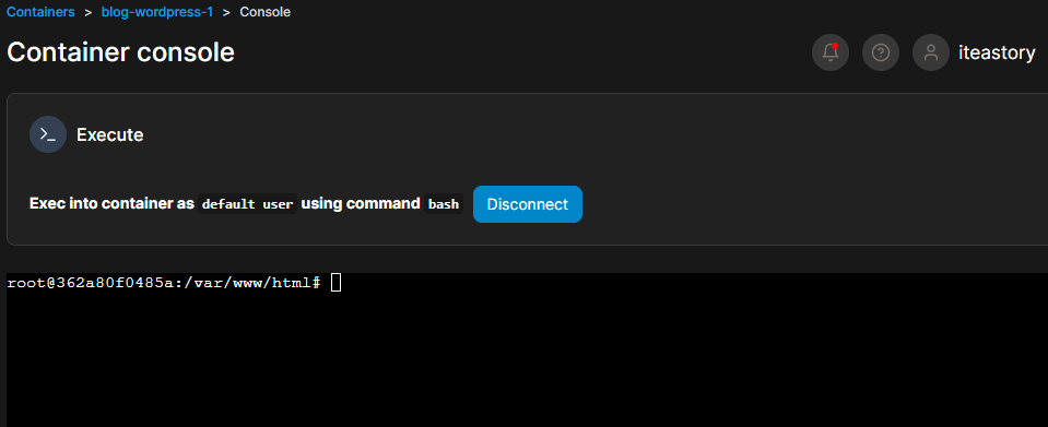 콘솔로 접속해서 웹 페이지가 있는 위치로 들어가 줍니다. 저는 Portainer에서 기본적으로 제공하는 웹 콘솔로 접근했습니다.