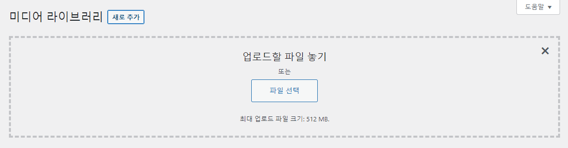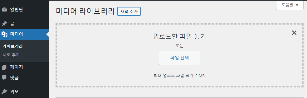 혹시 다른 업로드도 안되나 싶어 이미지를 업로드해 보려고 워드프레스의 미디어 라이브러리 페이지로 가보니 아래처럼 최대 업로드 파일 크기가 2MB라고 안내해주고 있었습니다.
