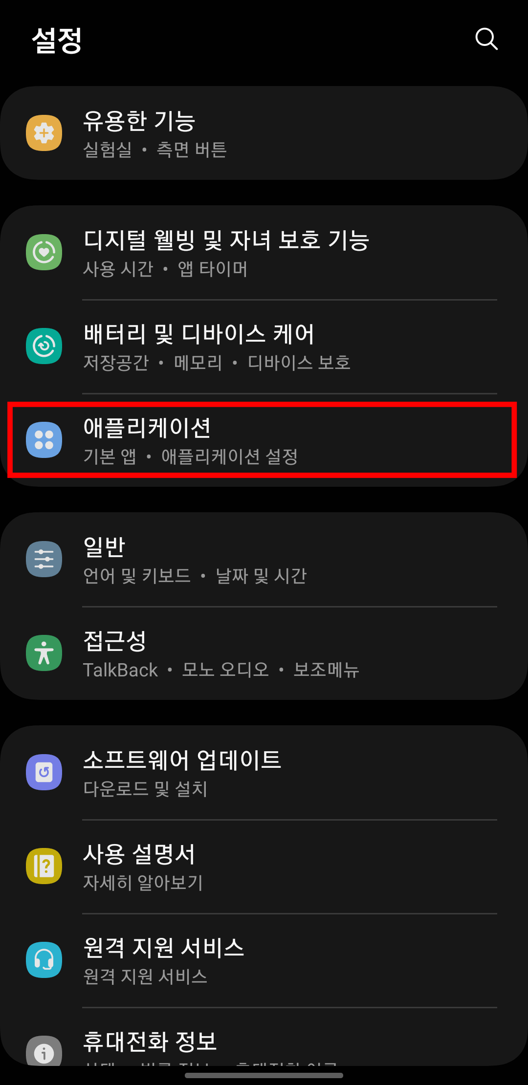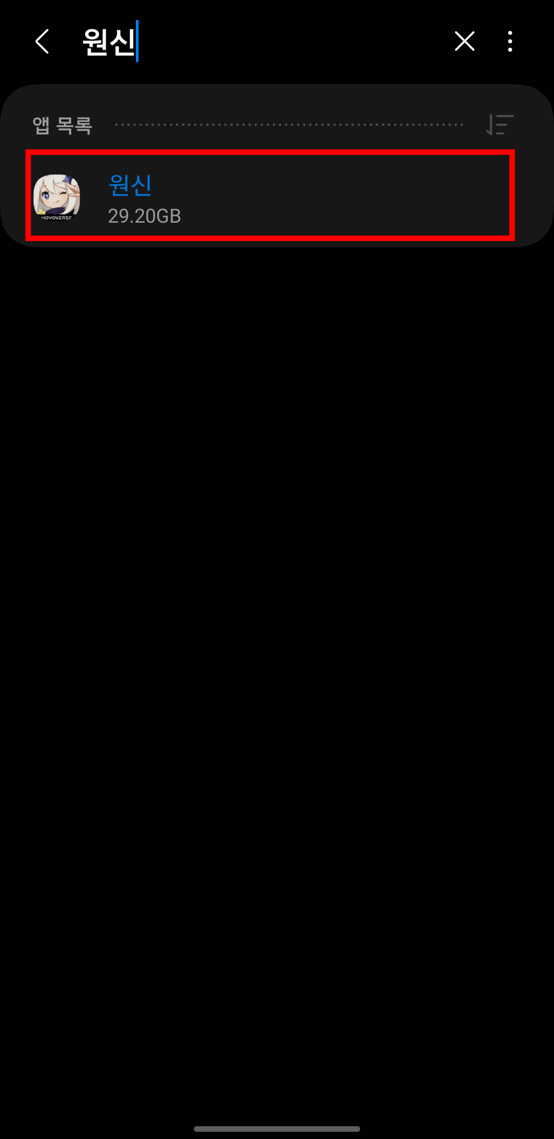 설정에서 애플리케이션을 찾아서 터치해 줍니다. 그리고 상단의 돋보기 모양 아이콘을 터치해서 원신을 찾아줍니다. 설치된 원신 애플리케이션이 보이면 터치해 줍니다.