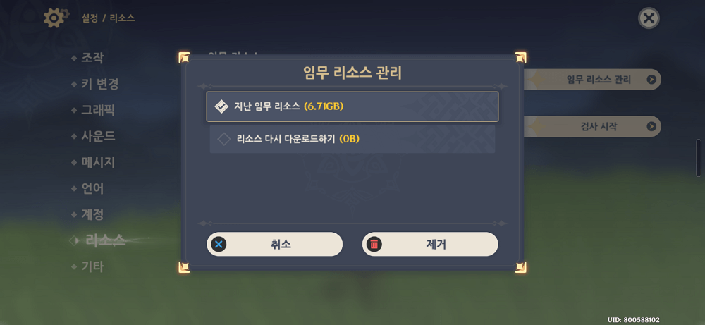 원신 게임 내의 설정으로 가줍니다. 그곳에서 리소스 화면으로 넘어가 보면 임무 리소스 관리라는 것이 보입니다. 이 임무 리소스 관리를 클릭해 보면 지난 임무 리소스를 제거할 수 있습니다. 다시 볼 일 없는 이미 진행한 임무의 리소스를 삭제해서 용량을 확보하는 것입니다.