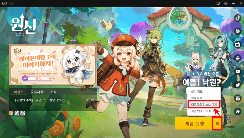 원신 게임 실행기를 실행해 주면 게임실행(혹은 업데이트) 버튼 옆의 ≡모양 버튼을 클릭하면 다운로드 리소스 삭제 항목이 보입니다. 다운로드 리소스 삭제를 하면 기존에 다운로드했던 게임 리소스를 모두 삭제하고 다시 업데이트하게 되므로 용량을 확보하고 업데이트를 진행할 수 있습니다.