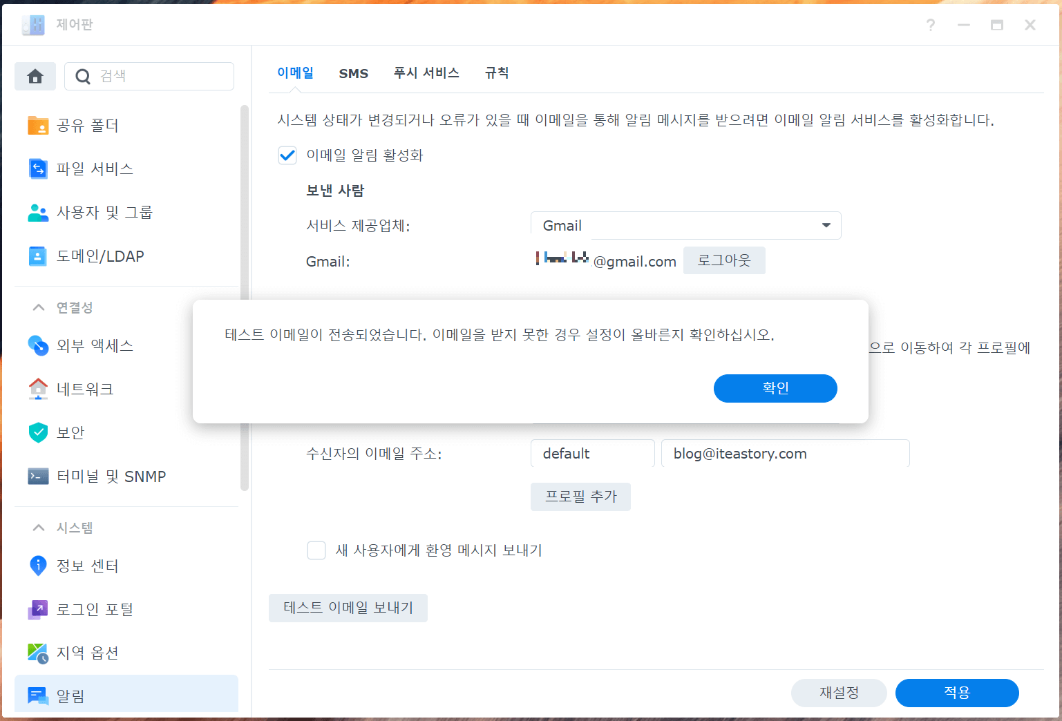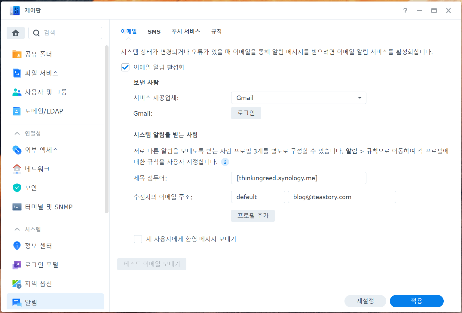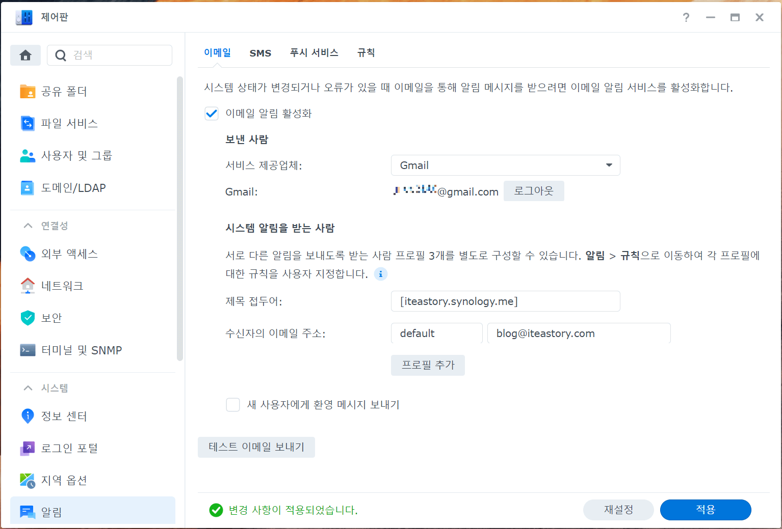 보낸 사람 부분에 Synology NAS가 메일을 발송하기 위해 필요한 부분이고 시스템 알림을 받는 사람이 내가 알림을 받을 메일 주소를 설정하는 부분입니다.