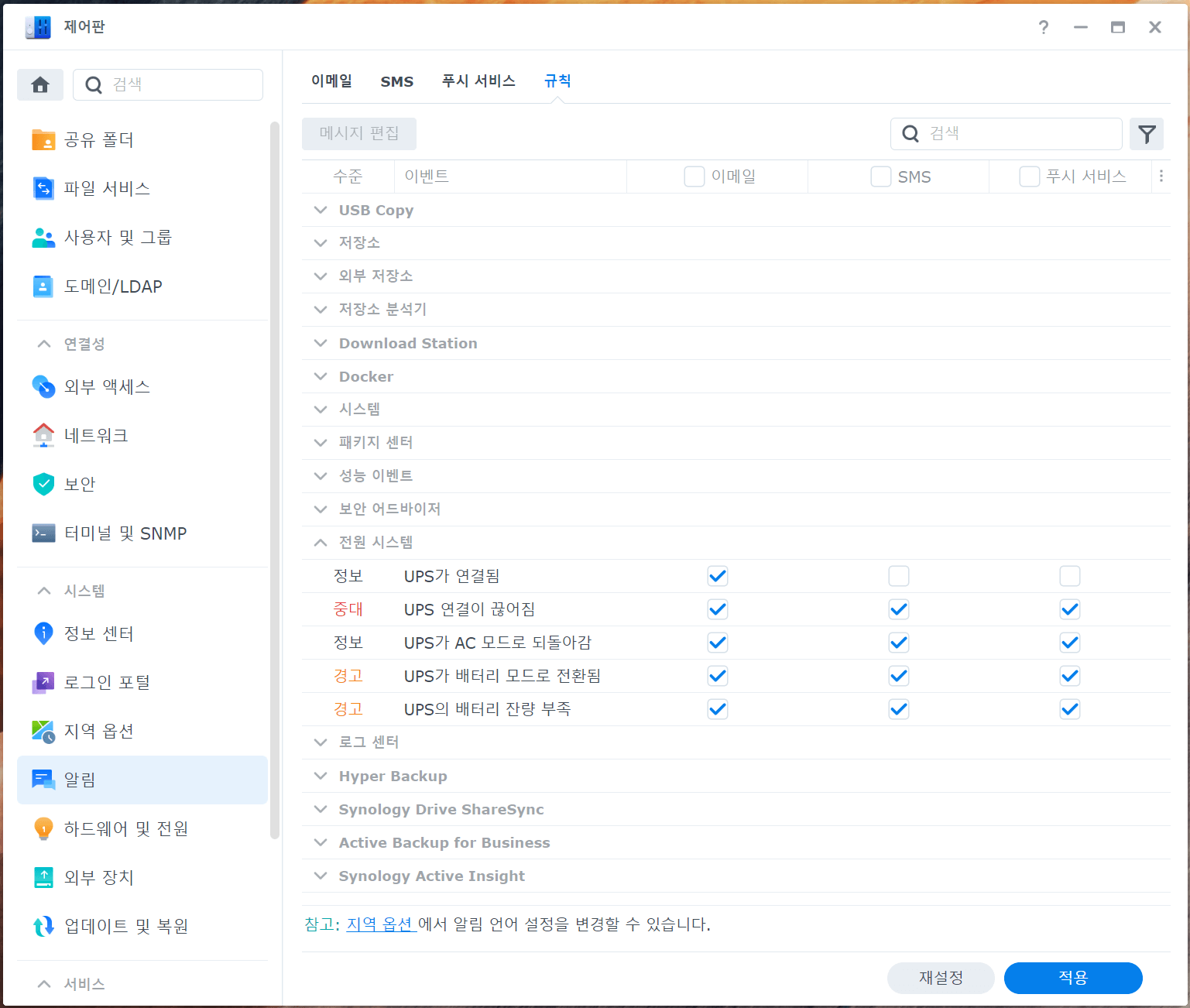 어떤 상황에서 Synology NAS가 이메일로 알림을 보낼지 간단하게 설정할 수 있습니다.