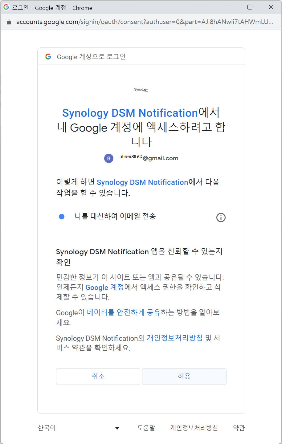 사용할 Gmail 계정을 선택해 주면 "Synology DSM Notification에서 내 Google 계정에 액세스 하려고 합니다"라는 메시지와 함께 나를 대신하여 이메일 전송 작업을 할 수 있다는 화면이 보입니다.