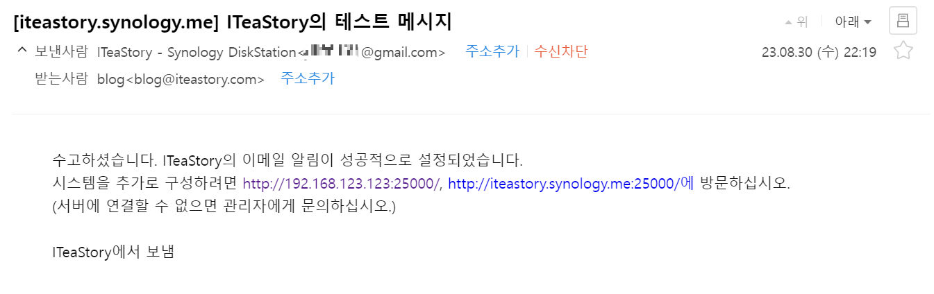 이렇게 설정을 하면 Synology NAS에서 이벤트가 발생할 때마다 자동으로 내가 설정한 메일로 알림을 받을 수 있습니다.