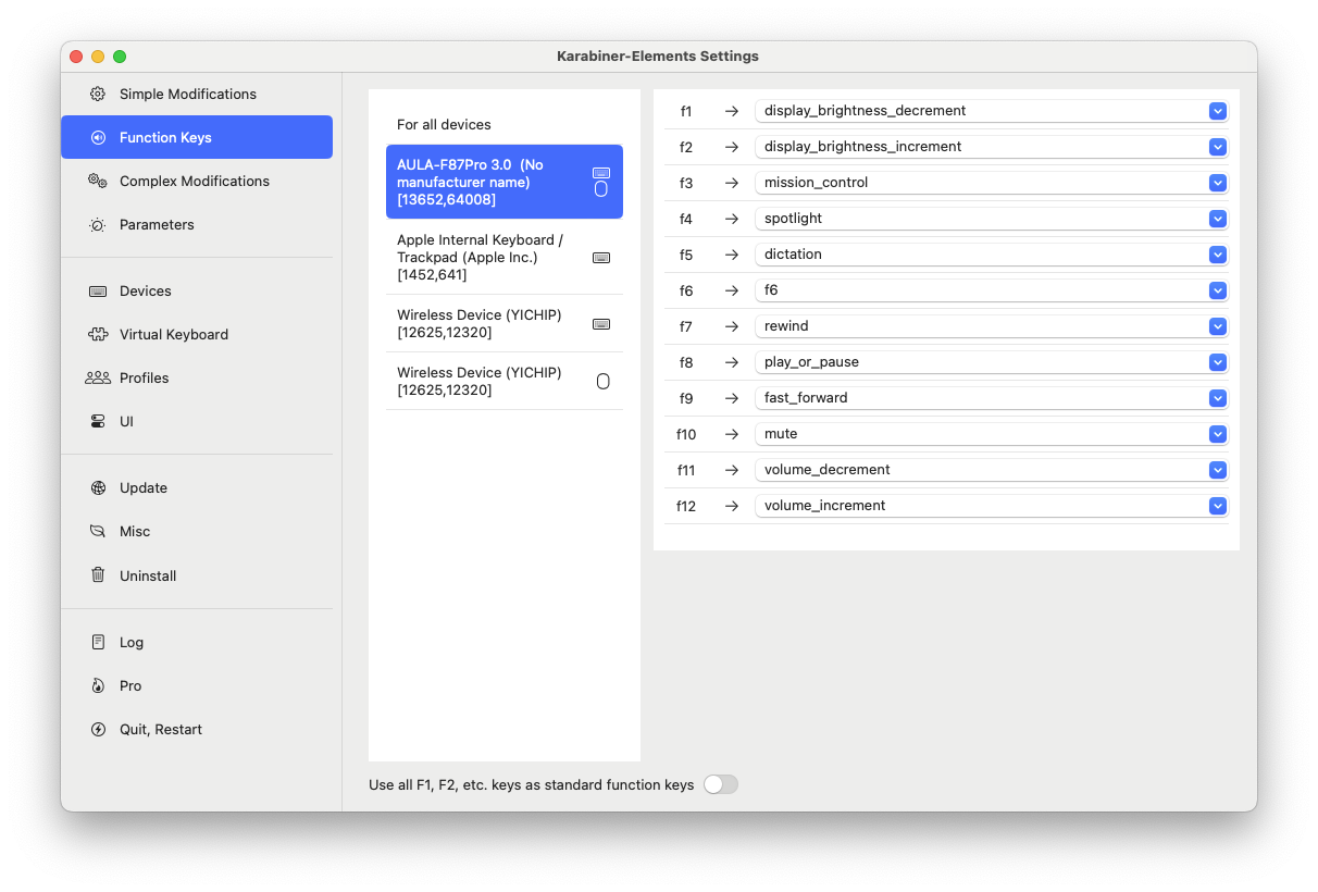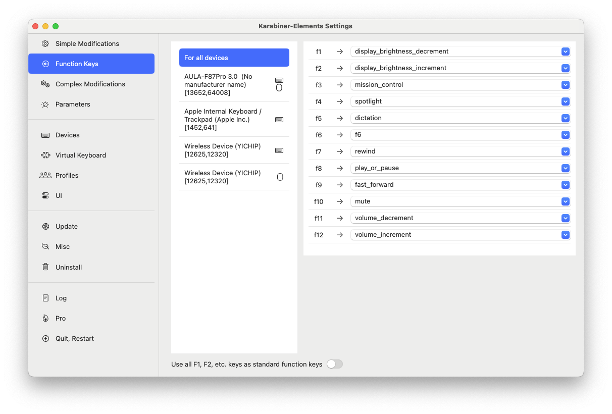하지만 윈도우OS 설정에는 원래와 같은 F1 ~ F12로 설정되어 있는데 이걸 이용하면 Karabiner-Elements를 사용해 미디어 키를 매핑할 수 있습니다.