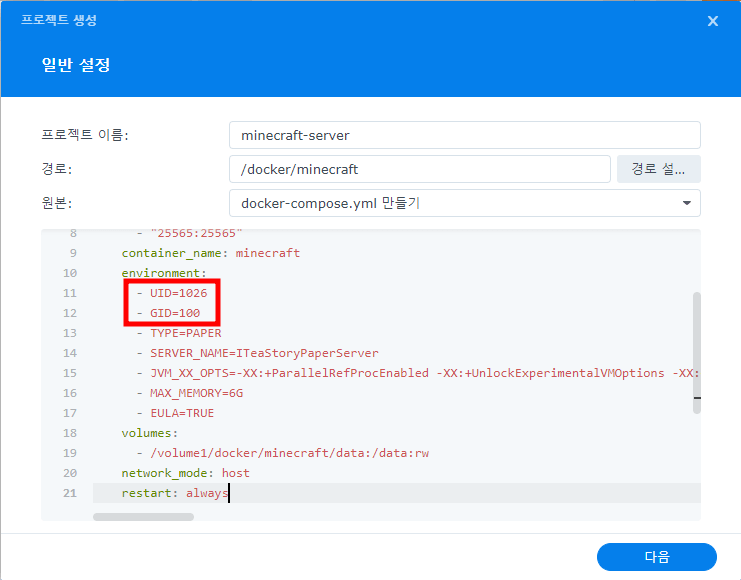 실제로 Docker의 data 디렉토리와 아까 지정한 프로젝트 경로의 NAS 디렉토리가 연결되기 때문에 실제로 내가 NAS의 디렉토리에서 파일을 수정하고 관리하려면 NAS의 계정 UID와 GID가 들어가야 하기 때문입니다.