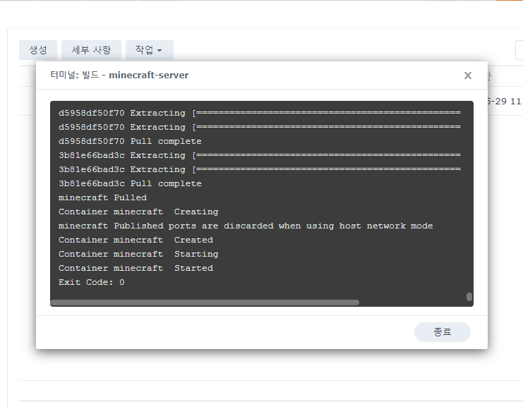 아래와 같이 컨테이너가 시작되고 생성이 완료되면 자동으로 마인크래프트 서버가 실행되어 있을 것입니다.