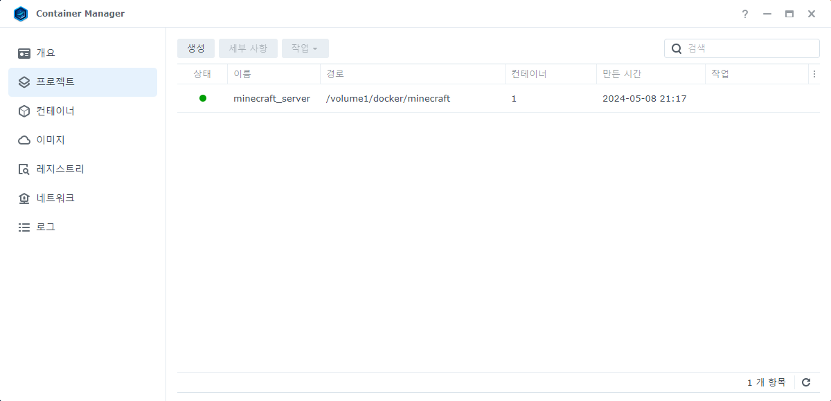 Container Manager를 실행하면 좌측에 개요, 프로젝트, 컨테이너, 이미지, 레지스트리, 네트워크, 로그 메뉴들이 보입니다.