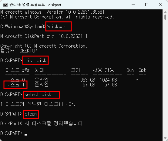 입력 후 DiskPart에서 디스크를 정리했습니다.라는 메시지가 보이면 완료된 것입니다.