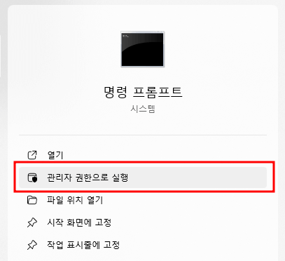 관리자 권한으로 명령 프롬프트를 실행하는 방법은 아래의 순서대로 따라 하시면 됩니다.