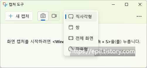 윈도우 캡처 도구 - 캡처 도구 창이 열리면, 상단에서 원하는 캡처 모드를 선택합니다.